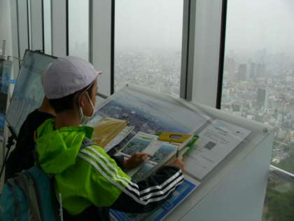 あいにくのお天気でしたが、ハルカスからの景色はよく見えました。近くの通天閣をはじめ、大阪城や長居競技場等、大阪の町について学んできた【施設や史跡】を上空から見ることができました。子どもたちは「すごーい」「めちゃちっちゃいけどみえる」と興奮気味に景色を見ていました。子どもたちは見えた建築物や気づいたことについて班でまとめてワークシートに書いていきました。