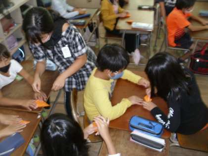 まず、「平和への願い込めて、鶴を折ってほしいです」と6年生から話があり、折り方を前で説明しながら、一緒に折り鶴を作りました。初めて折り鶴を作る児童も中にはいましたが、6年生の児童が実際に手本を見せながら丁寧に教えていました。