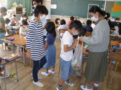 今日の児童集会の時間で、6年生の児童が、各学級へ折り鶴の折り方を教えに行きました。