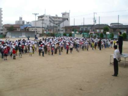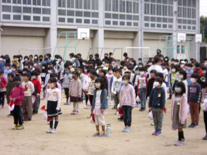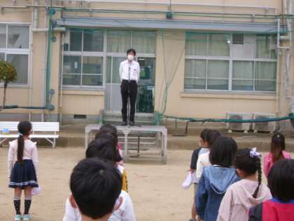 初めて運動場で行うので、集合に時間がかかってしまわないか心配をしていましたが、時間に余裕をもって運動場へ子どもたちは集まっていたので、スムーズに朝会を始めることができました。
