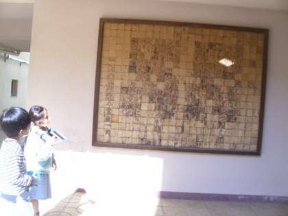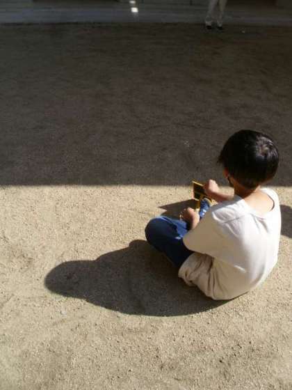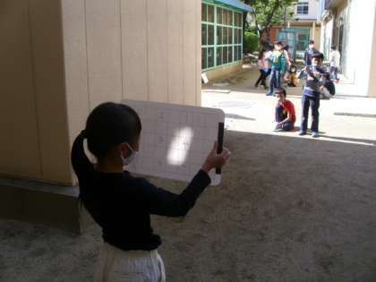 鏡を使って、壁や友だちの持つホワイトボードなどに太陽の光を子どもたちは反射させていました。