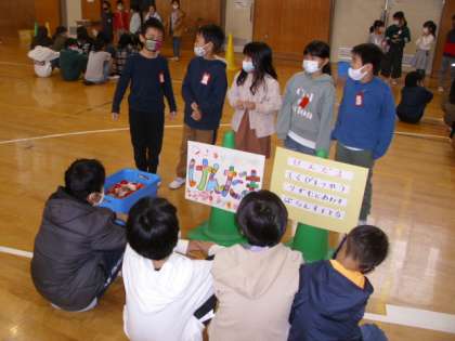 1年生の子どもたちは6年生に遊び方の説明をするときに「めっちゃ緊張する」といってドキドキしていたようですが、わかりやすく説明できました。また、6年生も1年生の説明をしっかり耳を傾け聞いていました。