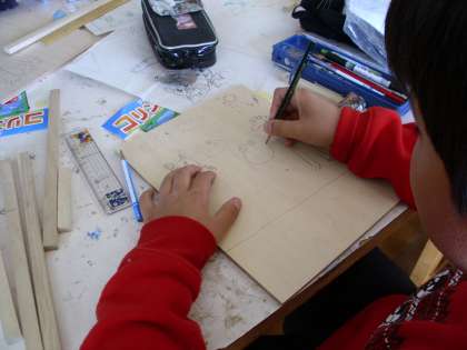 3年生がのこぎりや電気のこぎりをつかって「コリントゲーム」を作っています。