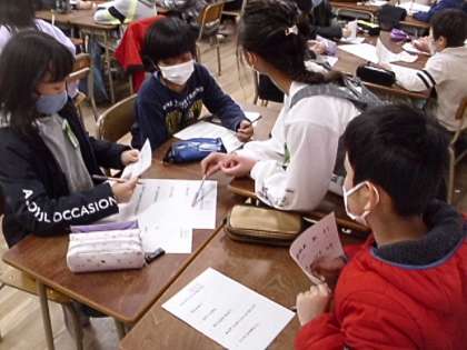 今回は、多文化共生社会をテーマに、「言葉や文字がわからない」ことについて各学年で学習を行いました。知らない文字や、わからない言葉ばかりだと、どんな気持ちになったのかを子どもたちは考えました。すると、「不安な気持ちになった」「どうしたらいいのか、わからなくなった」という感想があがりました。また、グループで話し合ったときには「ことばがどんな意味なのかがわかるとホッとした」「新しい言葉も知りたい」「相手の人が知らない言葉を私たちが伝えられるようにしていきたい」という意見が出ました。