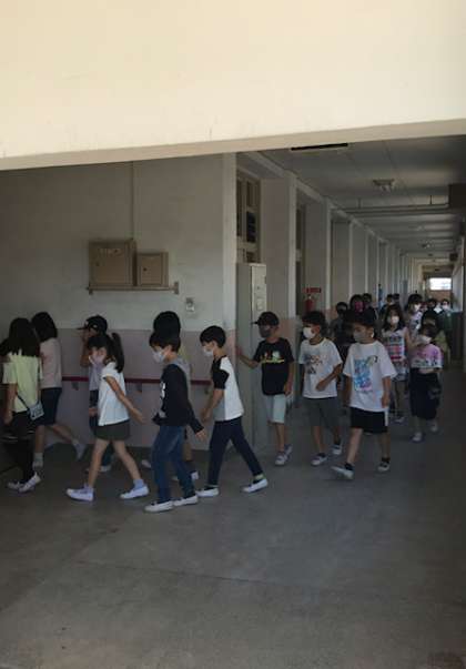 を確認し、先生の指示のもと、廊下へすばやく整列したり、静かに運動場へ避難したりするための訓練です。