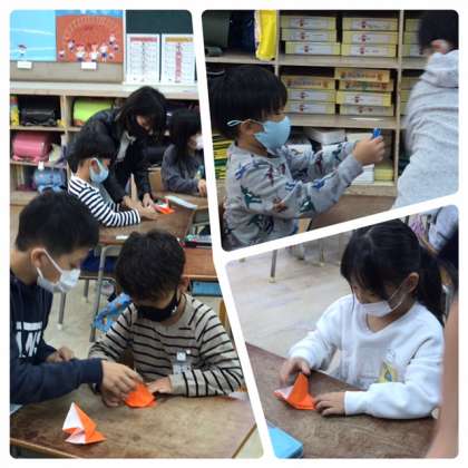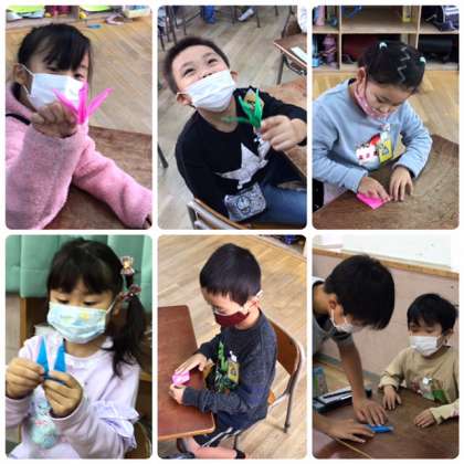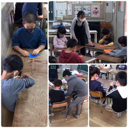 朝の集会の時間に6年生から折り鶴の折り方を教わりました。