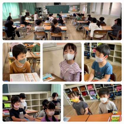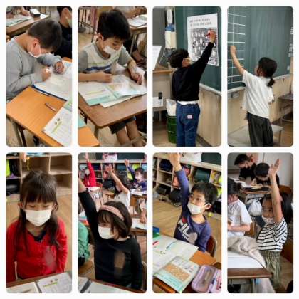 1年生のときに習ったことを振り返りながら、気をつけることなどをそれぞれ発表しました。先生が「正しい姿勢は覚えているかな?」と、問いかけると「こうやで!」と姿勢を正していました。