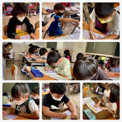 また、新出漢字の学習では、先生のお手本から画数や例文などを確認しました。一画一画丁寧に漢字ドリルに書き写しました。