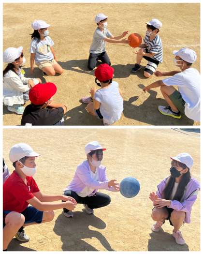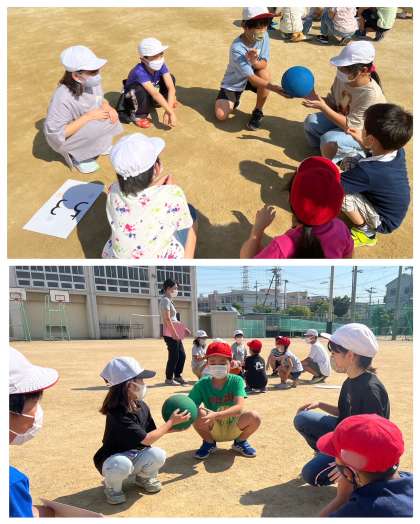 音楽が止まったタイミングでボールを持っている子が「名前」や「好きな食べ物」を紹介してみんなで楽しみました。