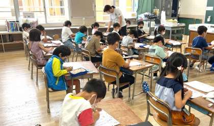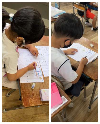 今日は「わ」と「を」の学習をしました。正しい書き順、鉛筆の持ち方、姿勢に気を付けて書きました。