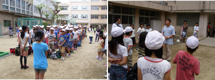 5年生が今日から二日間、淡輪の海洋センターに一泊移住にいきました。朝から出発式があり、保護者の方をはじめ、みんなで見送りました。