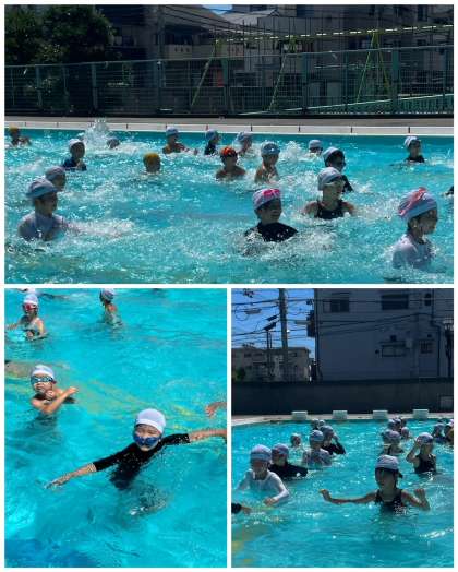 水に慣れるために、プールの中でジャンプしたり、水をかけ合ったりしました。