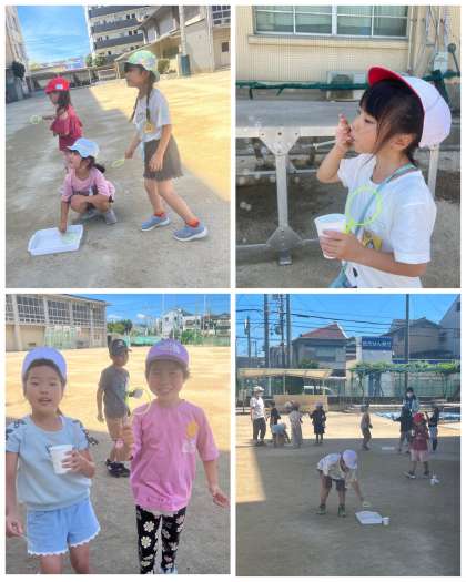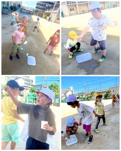 いろいろな道具を使いながら、口でふいたり、走ったりと、それぞれが思い思いのやり方であそびました。