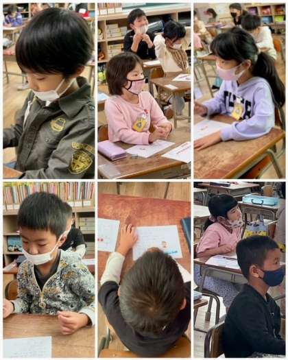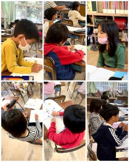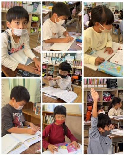国語では、カタカナの練習をしています。「スプーン」や「ノート」など、のばすカタカナをノートに書きました。子どもたちも自分たちの知っているのばすカタカナをたくさん発表しました。