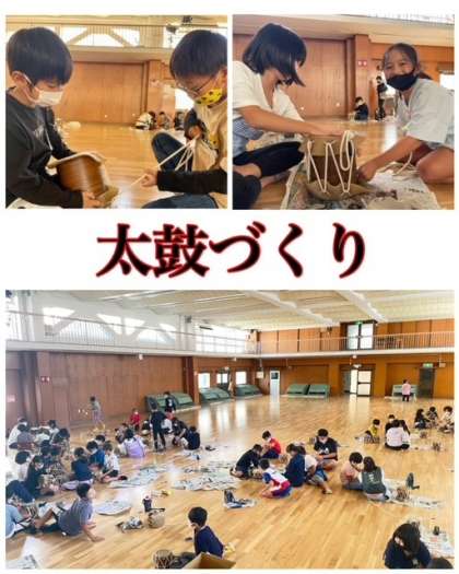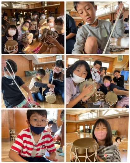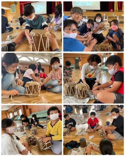 人権教育の取り組みで、牛の皮を切り、自分たちで手作りしています。