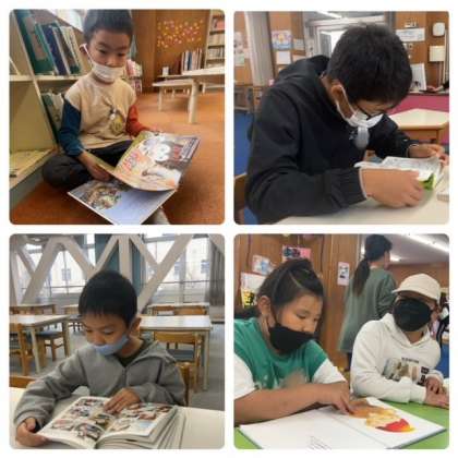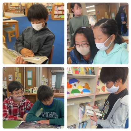 今日は雨ということもあり、いろいろな学年の子どもたちが図書館へやってきました。