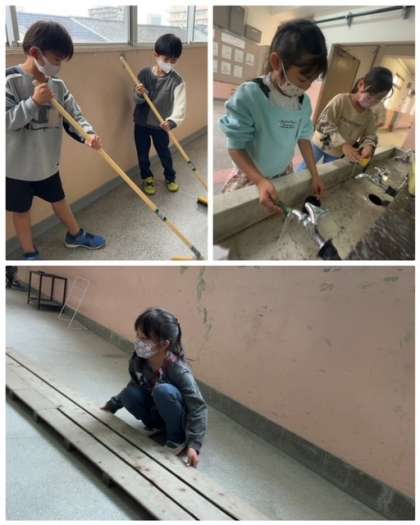 それぞれのそうじ場所へ移動し、ほうきやぞうきんできれいにします。