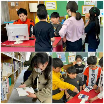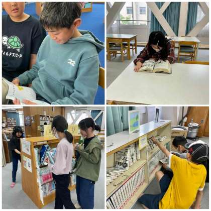 図書の時間には、はじめに借りていた本の返却をします。バーコードで読み取る作業を先生と係の子どもたちが協力して行っています。広い図書室でゆっくりと本を読むのは、子どもたちにとって楽しい学習の時間です。