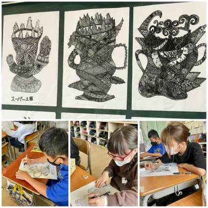 「〜〜の土器」を描きました。ボールペンを使って、同じ模様を繰り返し描いていき、できあがった土器にぴったり合う名前を考えます。子どもたちは自分が描いた土器にどんな名前をつけるのでしょうか。