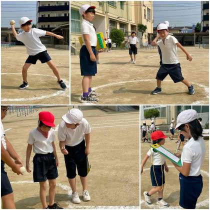 22日から24日は体力テスト期間です。2年生と5年生がペアになって実施しました。5年生は手本を見せたり、記録を書いたりして2年生をサポートしています。