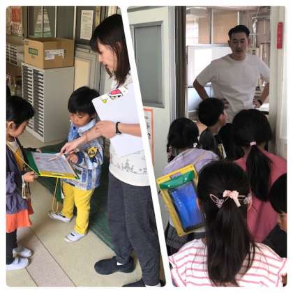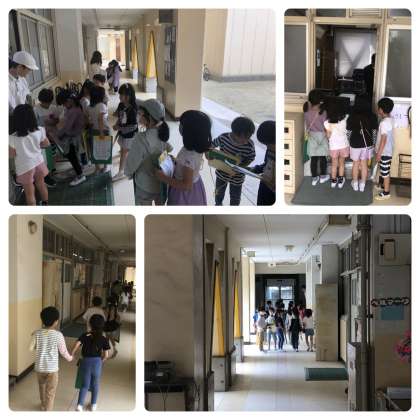1年生は学校たんけんに出発です。子どもたちは、グループのメンバーで相談しながら楽しく活動しています。