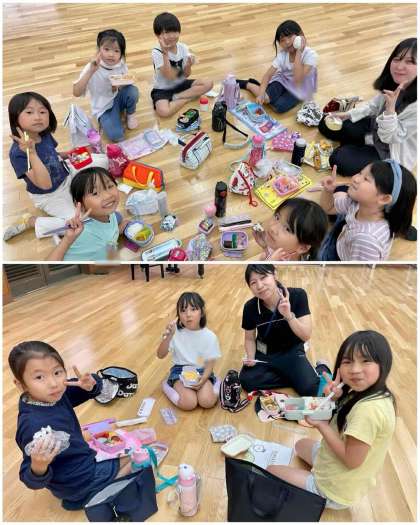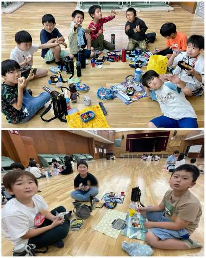 校外学習が延期になったので、多目的ホールでお弁当を食べました。「おべんとう おいしいよ!」