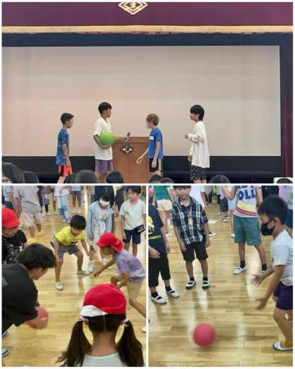 木曜日の朝は、縦割り班で集会をしています。集会委員会の子どもたちが中心になって行います。今日はボールを使ったゲームでした。