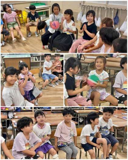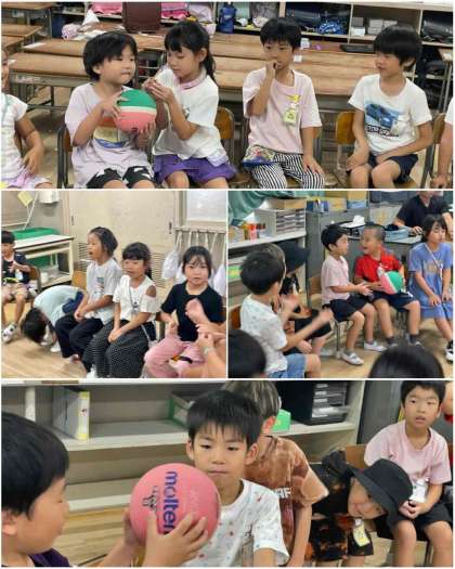 5時間目は楽しく爆弾ゲームです。みんなの好きな音楽が流れてどんどんボールを次の人へ回していきます。音楽に合わせて歌ったり踊ったりの1年生。ドキドキよりも、ノリノリの爆弾ゲームでした。