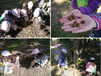 今日は1年生が住之江公園に秋みつけに行きました。みんなたっぷりのドングリを拾って学校に帰ってきました。