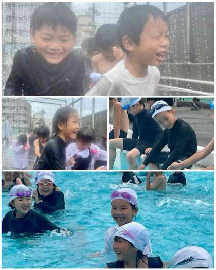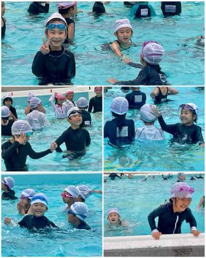 1年生は大きなプールに入って、水の中を動き回ったり、もぐったり浮いたりして水遊びをします。