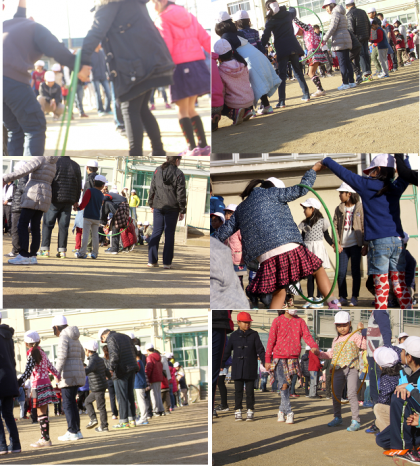 今日の子ども集会では1・6年 2.5年 3・4年がペアになって輪くぐりを行いました。声をかけながら協力して楽しめました。優勝したのは1・6年でした。