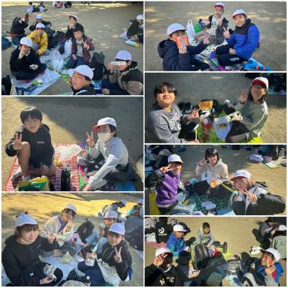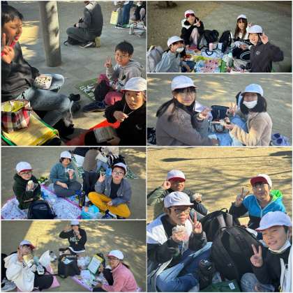 ぽかぽか陽気の元でみんなで買ったものの話をしながら食べていました。