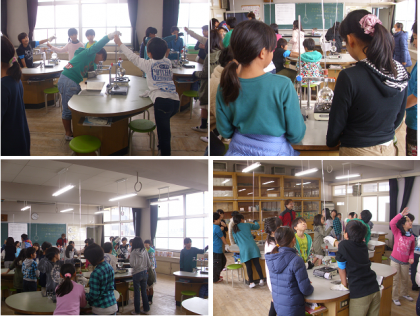 今日は4年生が理科の実験をおこないました。フラスコやガラス管などを使った実験装置に子どもたちは興味津々で、水の動きをじっと見つめていました。