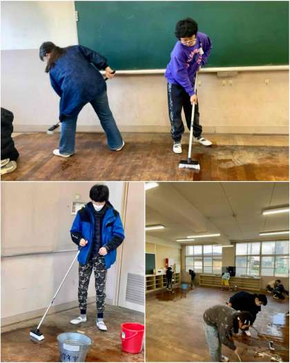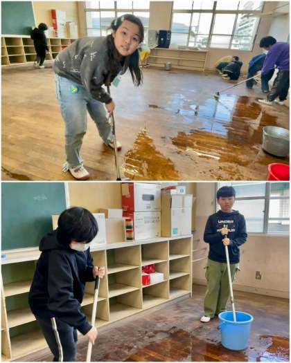 美化委員の子どもたちが、教室をゴシゴシと磨いて掃除をしています。