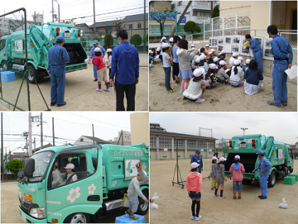 ごみの学習ということで、パッカー車が来てくれました。4年生は実際にごみをパッカー車に入れたり、運転席に座らせてもらったりしました。とても集中して話を聞いていました。