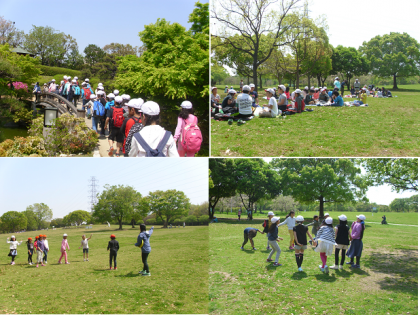 少し暑いくらいのよい天気の中、4年生は校外学習で大仙公園に行きました。お弁当を食べたり、広い公園で元気に遊んだりしました。