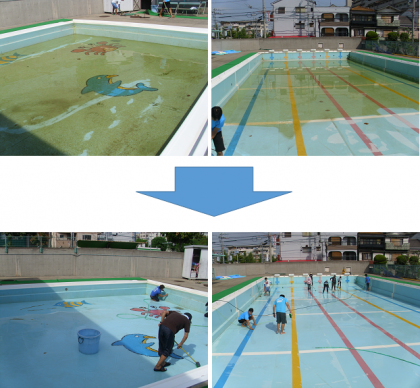 放課後に先生たちでプールを掃除しました。暑い中でしたが、一生懸命がんばりました!