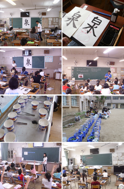 6年生は習字、5年生は植物の実験、1年生はアサガオの観察や算数などの学習の様子です。