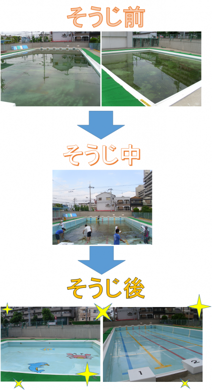 プール開きが来週にあります。プール水泳に向けて、教職員でそうじをしました。