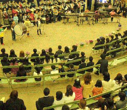 入学式では校長先生の話や受け持ちの先生の発表があったあと、2年生が楽しい合唱や合奏をして1年生を歓迎してくれました。1年生のみんなは楽しく聴くことができました。