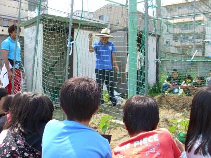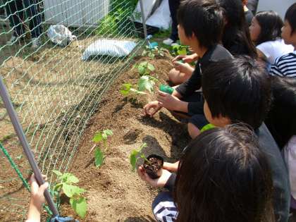 校長先生に植え方を教えてもらって、一株ずつ植えていきました。