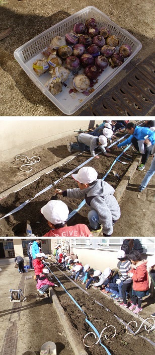 1年生みんなで、チューリップとヒヤシンスの球根を植えました。