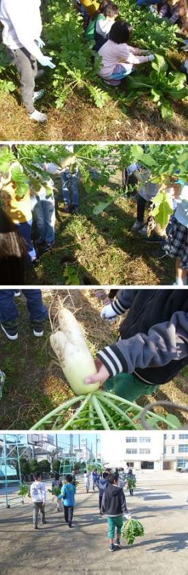 学習園で育った大根を、4年生が収穫しました。大きく成長した大根を獲ることができて楽しそうでした。