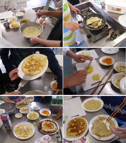 クレープは薄いので、火加減や裏返すのがとても難しいようでしたが、少しずつ慣れてきて、きれいに焼くことができるようになってきていました。