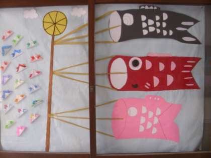 正門の玄関掲示に大きな鯉のぼりと、かぶとの折り紙が飾られています。掲示・新聞委員会の作品です。空を気持ちよさそうに泳いでいる姿が上手に表現されています。学校にお越しになった時には、ぜひごらんください。