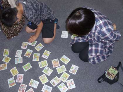 4年生は「大和川カルタ」をしました。大和川のつけかえにまつわる言葉が取り札になっていて、保護者の方も一緒になって遊びました。