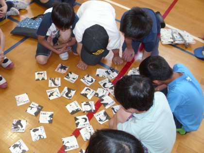 6年生は「歴史カルタ」をしました。教科書に登場する歴史上の人物にまつわるエピソードをヒントに取り札を保護者と一緒に取る姿が見られました。