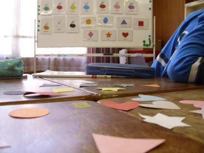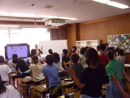 今日は、C-NETのジェニー先生が来られての外国語活動の授業がありました。5年生の授業では、数や色、形などの発音練習の後、ハートや星などに形を切った色紙で、英語カルタを楽しみました。子どもたちは英語に親しみをもって活動していました。