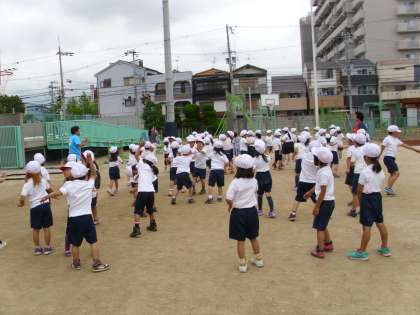 今日は1年生が月曜日のプール開きに備えて、準備運動やプールに入るときのルールなど実際にプールに行って練習しました。