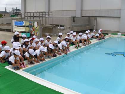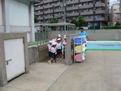 1年生は水がきれいになったプールを前にして、早く入りたいと思っている様子でした。
